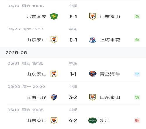泰山本场前近5轮战绩